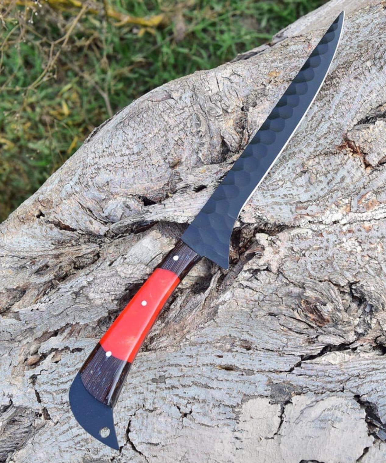Razor-sharp handmade Damascus steel fillet knife designed for precision fish and meat cutting.